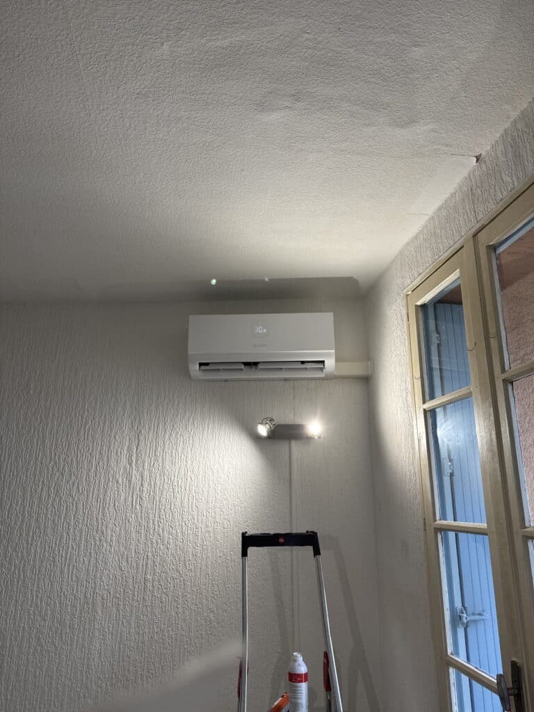 Sur le chantier, plusieurs spécificités techniques ont orienté notre approche. L’unité intérieure devait être positionnée en hauteur, près du plafond dans un angle, juste à côté d’une porte-fenêtre. Autant dire que l’espace de manœuvre était réduit et que le cheminement des liaisons frigorifiques et électriques s’annonçait… délicat. Le mur présentait également un revêtement texturé, ce qui impose des fixations robustes et des finitions particulièrement soignées pour éviter toute dégradation esthétique.