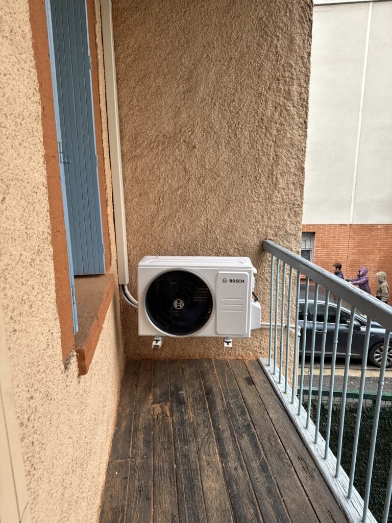 Cette installation climatisation Bosch Quartier Saint Michel à Toulouse illustre notre savoir-faire : diagnostic précis, solutions techniques adaptées et finitions soignées pour une climatisation réversible performante et discrète. Le chantier a été mené dans le respect des normes (fluides frigorigènes, électriques) et avec la volonté d’un rendu esthétique malgré les contraintes (angle, mur texturé, proximité d’ouverture).